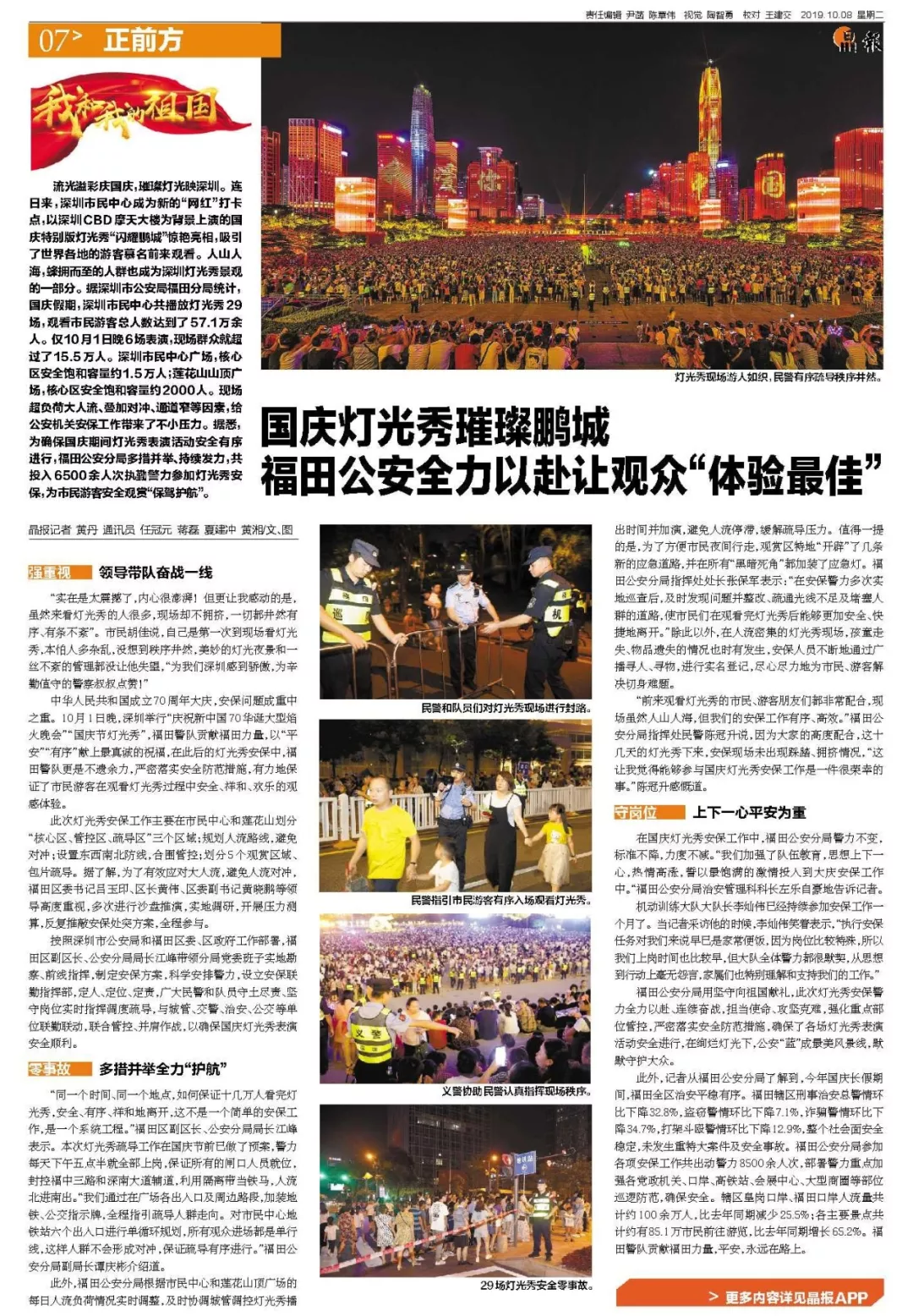 中華人民共和國成立70周年大慶,安保問題成重中之重。10月1日晚,深圳舉行“慶祝新中國70華誕大型焰火晚會”、“國慶節(jié)燈光秀”,福田警隊貢獻福田力量,以“平安”、“有序”獻上最真誠的祝福,在此后的燈光秀安保中,福田警隊更是不遺余力,嚴密落實安全防范措施,有力地確保了市民游客在觀看燈光秀過程中安全、祥和、歡樂的觀感體驗。