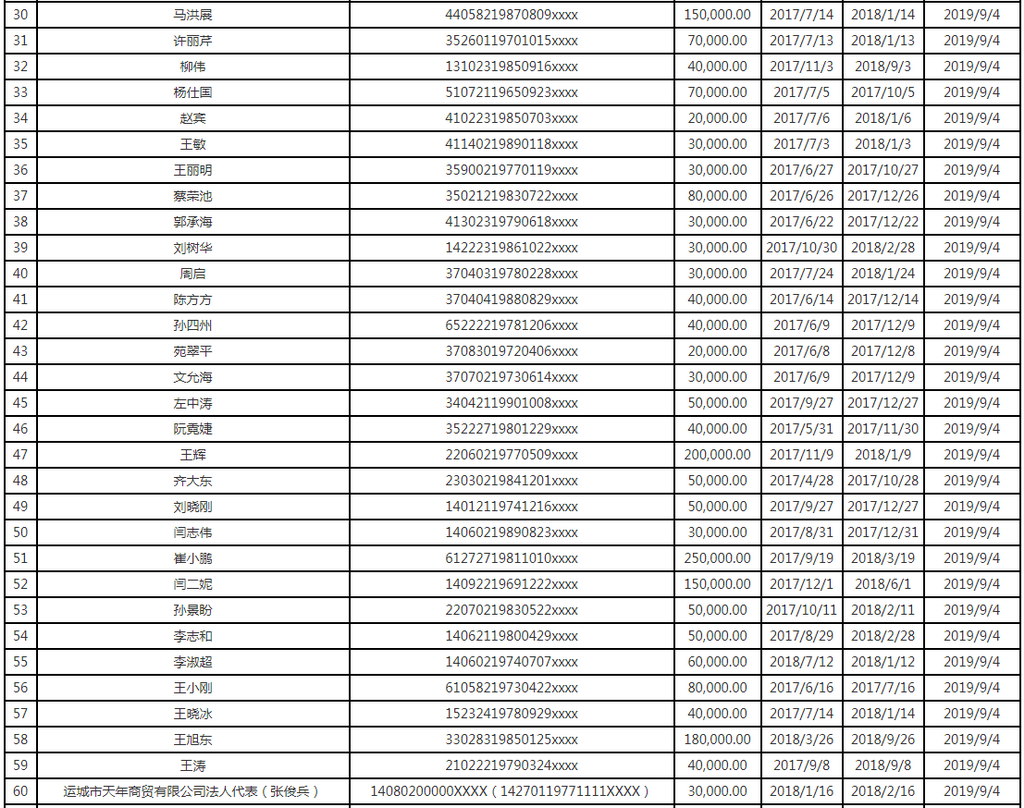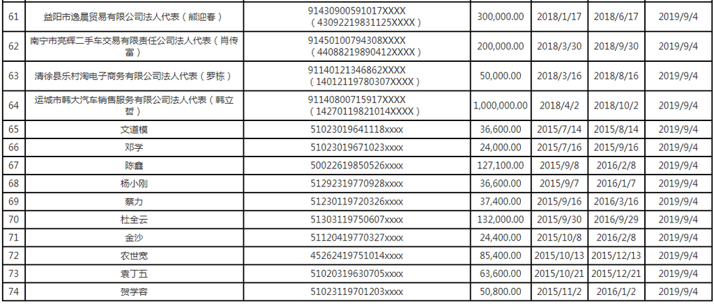 據(jù)深圳市地方金融監(jiān)督管理局披露的網(wǎng)絡借貸信息中介機構失信人信息表顯示,74名失信網(wǎng)貸借款人中,有5名是企業(yè)的法人代表,分別為運城市天年商貿(mào)有限公司法人代表張俊兵、益陽市逸晨貿(mào)易有限公司法人代表熊迎春、南寧市亮輝二手車交易有限責任公司法人代表肖傳富、清徐縣樂村淘電子商務有限公司法人代表羅棟及運城市韓大汽車銷售服務有限公司法人代表韓立哲。其中,運城市韓大汽車銷售服務有限公司法人代表韓立哲逾期金額居首,達到了100萬元,借款時間是2018年4月2日,逾期開始時間是2018年10月2日,截至2019年10月9日已逾期一年多。