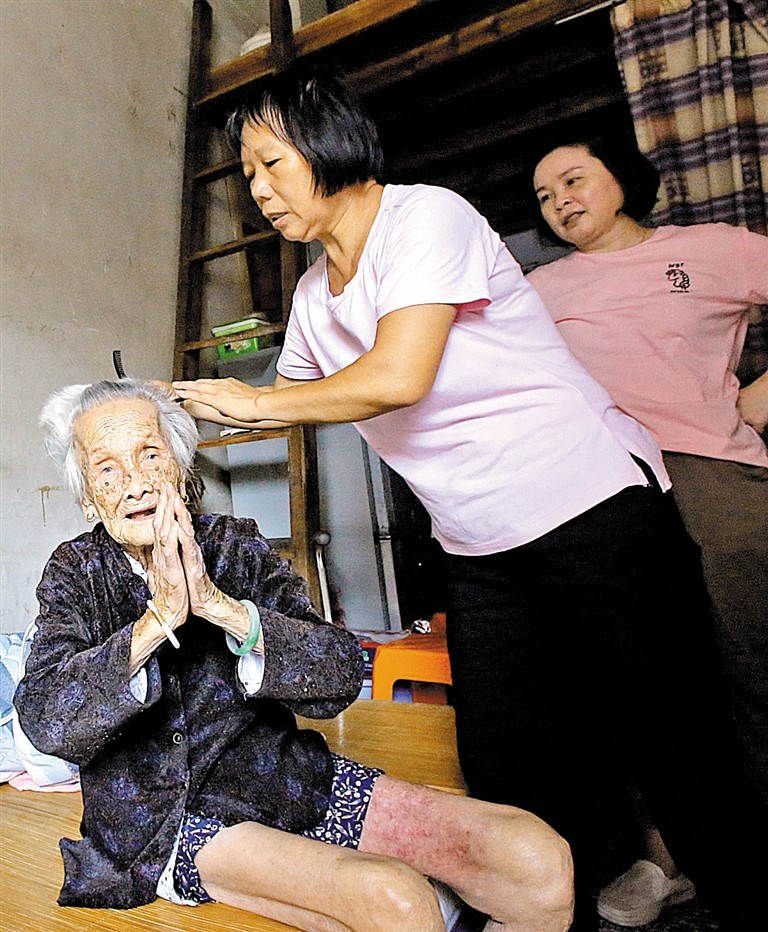 陳汝金老人喜歡打本地花牌,打到了99歲,后來(lái)腰部退化,不能久坐,她才沒(méi)有再打花牌。吃飯方面,陳汝金也有自己的主張,不求好不求貴,簡(jiǎn)簡(jiǎn)單單活到老,“外婆以前是生產(chǎn)隊(duì)的炊事員,直到去年她還能自己做飯呢?!痹谖男〗憧磥?lái),如此長(zhǎng)壽的外婆也沒(méi)有特別的養(yǎng)生之道,“保持好心態(tài),順其自然就是最長(zhǎng)壽的秘方。”