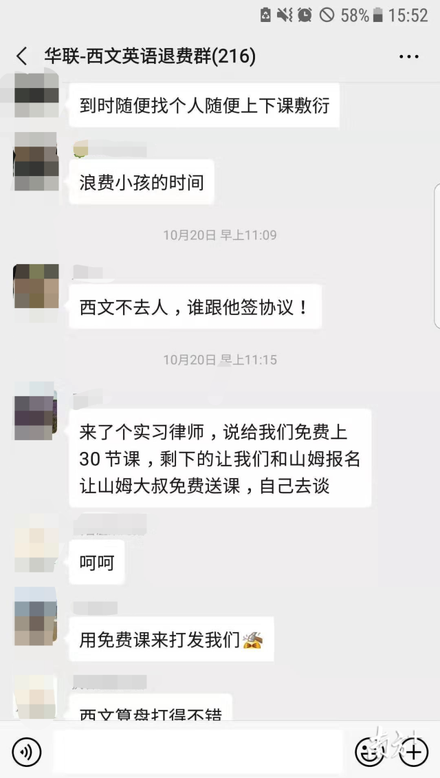 陳先生介紹,消費(fèi)者自發(fā)組建的“華聯(lián)-英語西文退費(fèi)群”里,和他有一樣遭遇的還有215人。每人交學(xué)費(fèi)1-3萬不等,按學(xué)費(fèi)2萬/人算,涉及學(xué)費(fèi)至少400萬元。