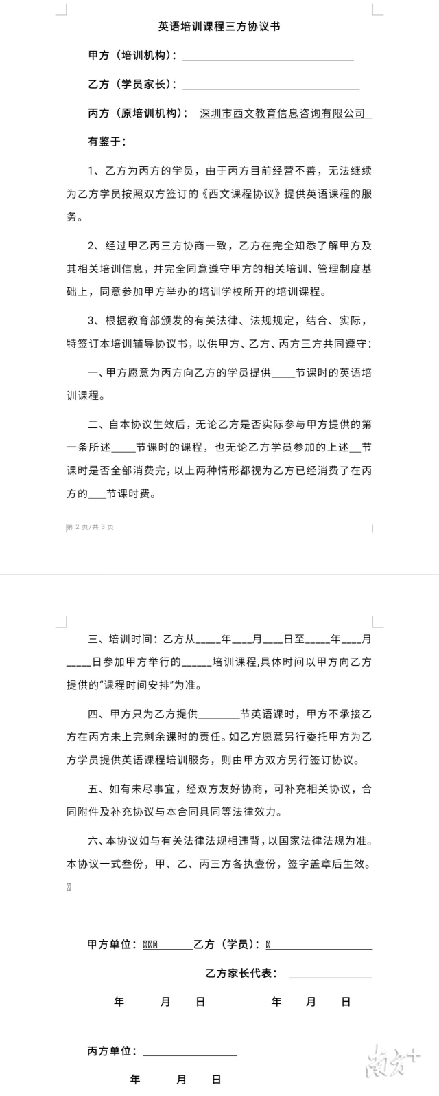 退費(fèi)群里的周女士介紹,10月20日,西文英語提供了一份“英語培訓(xùn)課程三方協(xié)議書”,但上面很多條款都沒有寫清楚。西文英語委托的律師稱,山姆大叔少兒英語愿意給西文英語的學(xué)員免費(fèi)提供30節(jié)課程,但學(xué)員在西文英語其他剩余課時的解決方案,需自行和山姆大叔協(xié)商。