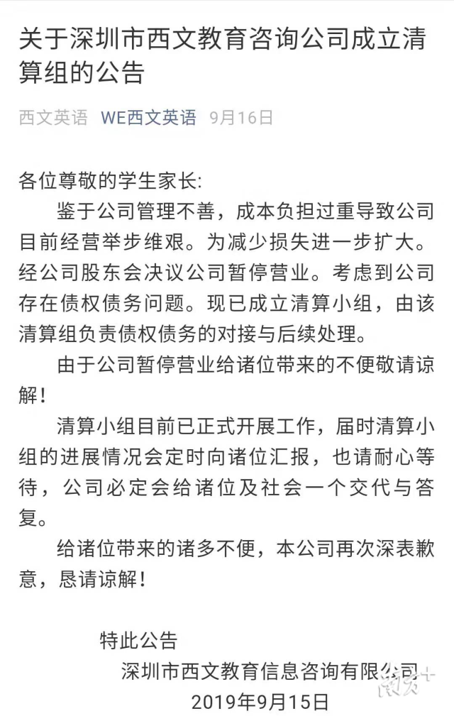9月19日推文稱“我司全體股東將積極配合政府相關(guān)職能部門協(xié)調(diào)、解決處理學(xué)生學(xué)費(fèi)的善后事宜,近期我司將制定出妥善的處置方案。”
