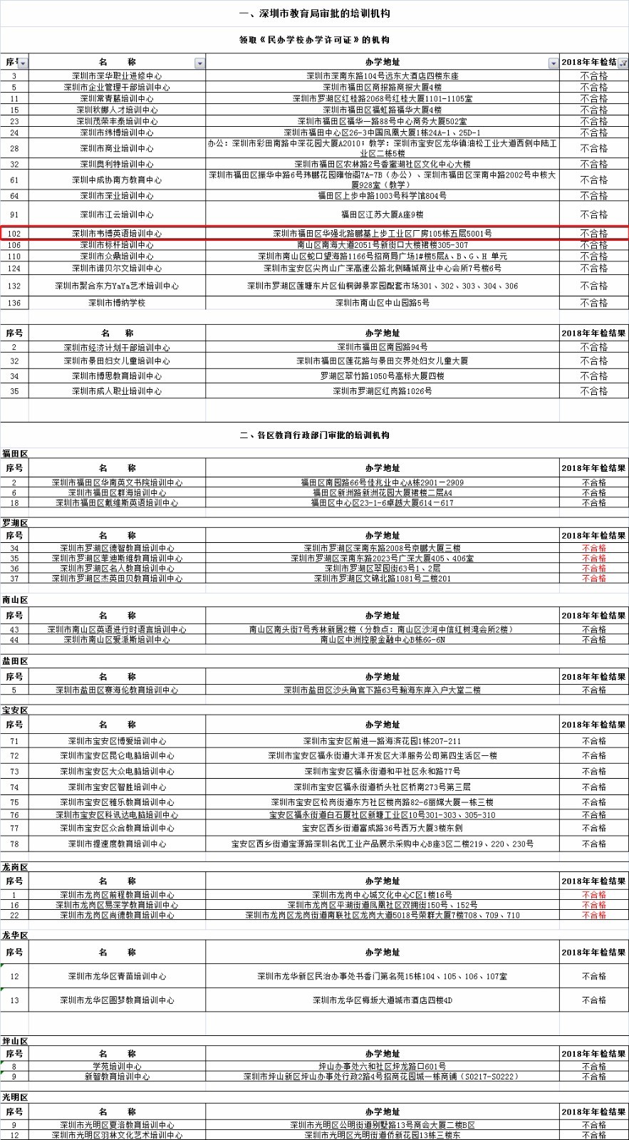 據(jù)悉,此次公告包括取得《中華人民共和國(guó)民辦學(xué)校辦學(xué)許可證》和《深圳市成人教育辦學(xué)機(jī)構(gòu)注冊(cè)證》的教育培訓(xùn)機(jī)構(gòu)的辦學(xué)基本信息、2018年度年檢結(jié)果、新設(shè)立培訓(xùn)機(jī)構(gòu)及培訓(xùn)機(jī)構(gòu)分教點(diǎn)地址等基本信息。