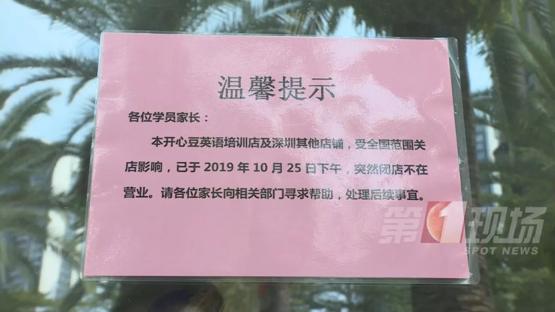同時(shí),家住龍崗的多名家長,今天也聚集在、鳳凰城商業(yè)中心里的一家開心豆少兒英語門前。這家店同樣是悄無聲息結(jié)業(yè)倒閉,人去樓空。商場管理方也貼出公告稱,這家店9月起就欠租,目前平湖長廊警務(wù)室已成立專門工作組。
