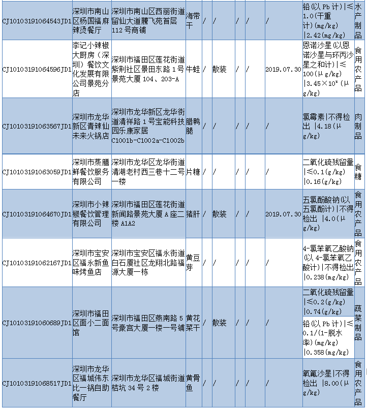見圳客戶端 ·深圳新聞網(wǎng)2019年11月6日訊 11月5日,深圳市市場(chǎng)監(jiān)督管理局發(fā)布2019年第四十期食品安全抽樣檢驗(yàn)情況通報(bào),通報(bào)稱,深圳市市場(chǎng)監(jiān)督管理局于2019年8-9月組織對(duì)我市餐飲環(huán)節(jié)的食品開展了抽樣檢驗(yàn)工作,本次共抽檢餐飲環(huán)節(jié)食品671批次,涉及餐飲環(huán)節(jié)經(jīng)營(yíng)主體584家次,共檢測(cè)食品指標(biāo)3385項(xiàng)次。其中檢出不合格樣品12批次,涉及不合格食品類別有酒類2批次均為米酒;肉制品2批次為臘肉和臘鴨腿;食糖1批次、食用農(nóng)產(chǎn)品5批次牛蛙、豬肝等在列;蔬菜制品1批次、水產(chǎn)制品1批次。