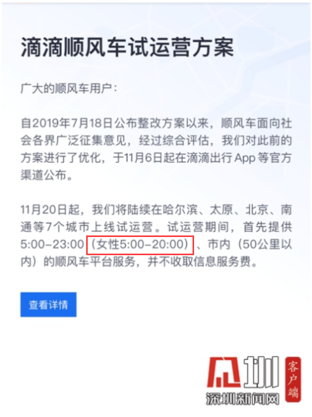 面對(duì)爭(zhēng)議,滴滴調(diào)整了:對(duì)所有順風(fēng)車(chē)用戶提供服務(wù)的時(shí)間均改為5:00-20:00