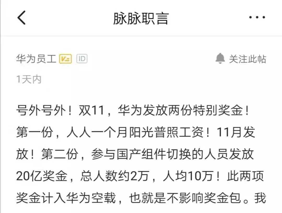還有網(wǎng)友表示,“20億是只獎(jiǎng)勵(lì)大概兩萬人,針對(duì)的是把美國(guó)零部件替換成華為自己零部件的研發(fā)崗位人員,其他所有華為正式員工,包括上面的兩萬多人,獎(jiǎng)勵(lì)一個(gè)月工資,工資參考的10月份的工資,年終獎(jiǎng)不受影響。”