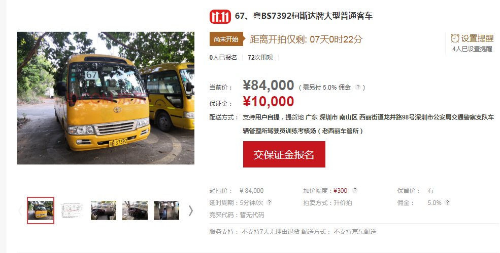 競買人應于拍賣會前在京東拍賣平臺進行實名登記注冊,注冊成功后請按京東拍賣平臺的提示進行操作;競買人在對拍賣標的物首次確認出價競拍前,按系統(tǒng)提示報名繳納10000元/輛的保證金;在競價過程中,請競買人按規(guī)定的加價幅度300元出價,若自行出價,請仔細核對好出價金額,若出現(xiàn)出價金額錯誤的情況,由買受人自行承擔后果;拍賣成交后,買受人請于拍賣成交之時起72小時內(nèi)全額支付拍賣成交價款、拍賣傭金、增值稅及附加、機動車轉(zhuǎn)移登記車牌費,并到廣東華士德(深圳)拍賣行有限公司所在地(深圳市羅湖區(qū)中興路219號華興酒店4樓)簽署《拍賣成交確認書》及辦理相關手續(xù)。