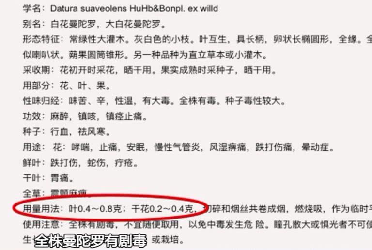 據(jù)了解,曼陀羅又名洋金花,有一定的藥用價值,但也有毒理作用,有多例報(bào)道介紹過曼陀羅致人中毒事件。據(jù)相關(guān)資料顯示,曼陀羅葉應(yīng)用藥0.4克至0.8克,干花用藥0.2克至0.4克,使用注意事項(xiàng)提及到,全株曼陀羅有劇毒,不宜隨便取用,以免中毒發(fā)生危險。