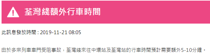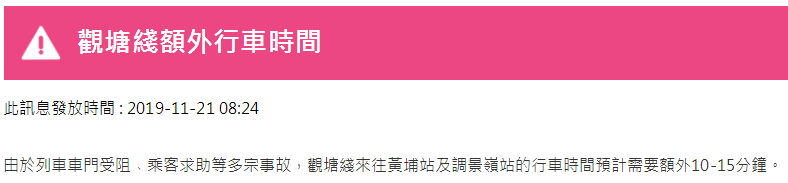 此外,目前,由于列車(chē)車(chē)門(mén)受阻,乘客求助等多宗事故,港島線(xiàn)來(lái)往堅(jiān)尼地城站及柴灣站、荃灣線(xiàn)來(lái)往中環(huán)站及荃灣站、觀(guān)塘線(xiàn)來(lái)往黃埔站及調(diào)景嶺站,行車(chē)時(shí)間預(yù)計(jì)需要額外10至15分鐘。