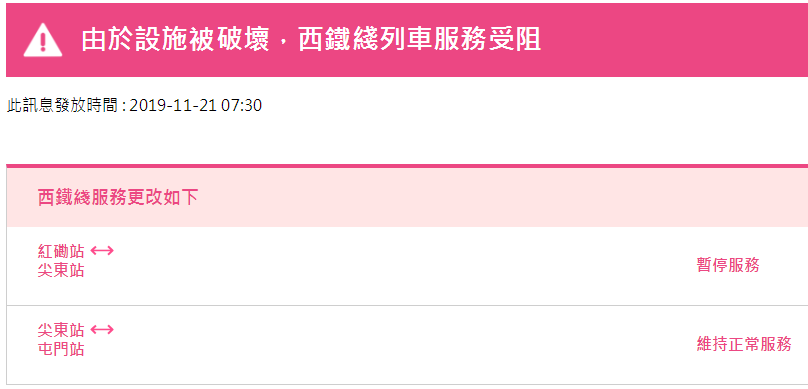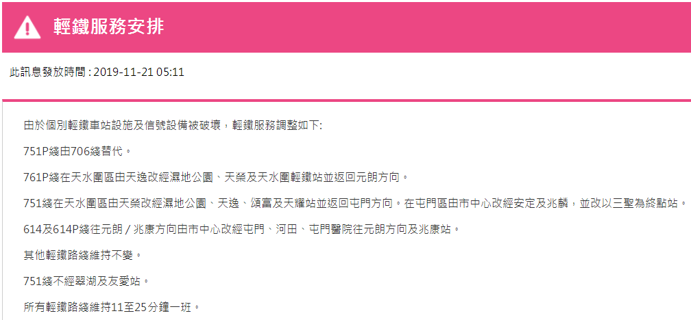 據(jù)港鐵消息,11月21日,香港地鐵各線(xiàn)(機(jī)場(chǎng)快線(xiàn)除外)、輕鐵及港鐵巴士的服務(wù)將于晚上11時(shí)結(jié)束。西鐵線(xiàn)/東鐵線(xiàn)紅磡站及大學(xué)站繼續(xù)關(guān)閉。需要注意的是,元朗站將于下午2時(shí)關(guān)閉,列車(chē)不停元朗站,此外,個(gè)別車(chē)站出入口會(huì)暫時(shí)關(guān)閉。