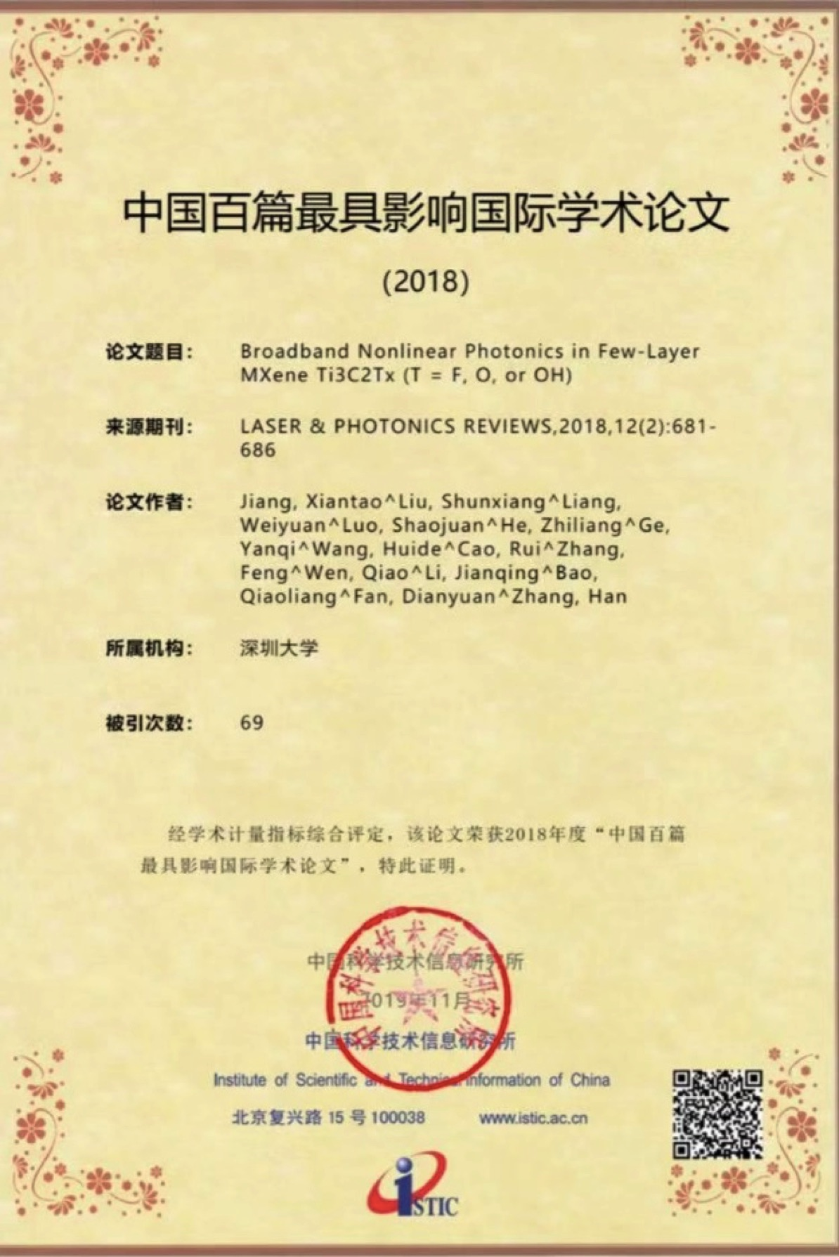 深圳特區(qū)報(bào)2019年11月22日訊 11月19日,中國科學(xué)技術(shù)信息研究所在北京召開中國科技論文統(tǒng)計(jì)結(jié)果發(fā)布會(huì),公布了2018年中國百篇最具影響國際學(xué)術(shù)論文。深圳大學(xué)張晗教授課題組2篇論文入選,深大入選數(shù)量在中國內(nèi)地高校和研究機(jī)構(gòu)中并列第10。