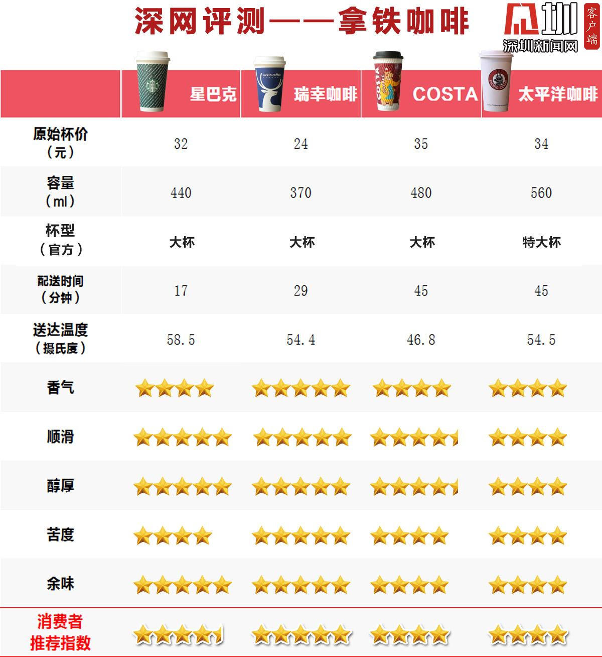綜合“拿鐵咖啡(熱)”主觀評(píng)測(cè)的5個(gè)維度(香氣、順滑、醇厚、苦度、余味),最終瑞幸在消費(fèi)者推薦指數(shù)評(píng)分中脫穎而出收獲5星好評(píng),星巴克收獲4星半好評(píng)位居第二,Costa4、太平洋僅獲得4星評(píng)價(jià)。