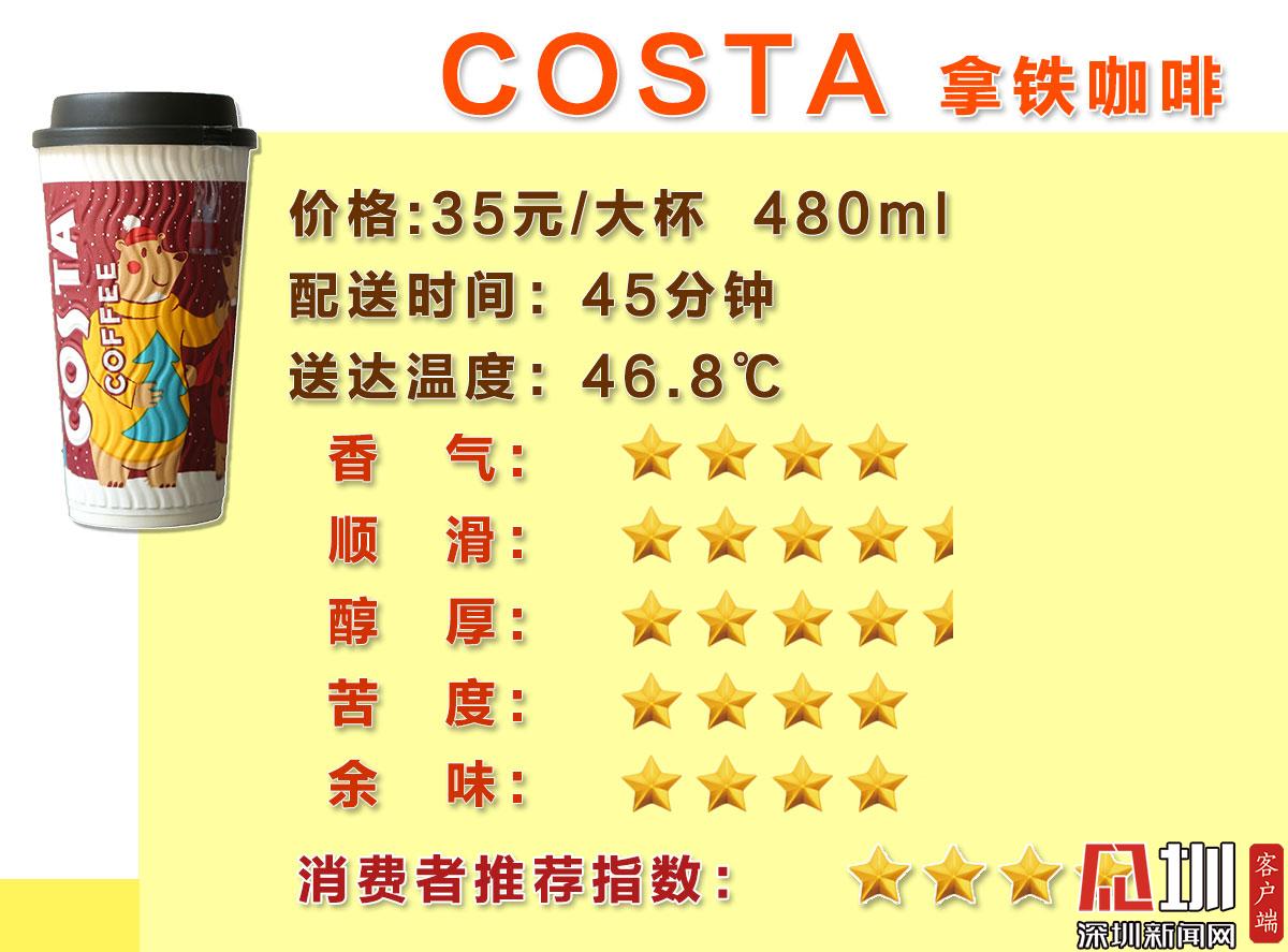 時(shí)間及溫度方面,因各品牌咖啡配送距離不一致,該兩項(xiàng)數(shù)據(jù)僅做參考使用。(配送時(shí)間段:13:30-15:30)在外賣(mài)到達(dá)時(shí)第一時(shí)間測(cè)量溫度并記錄配送時(shí)間,具體數(shù)據(jù)如下:星巴克咖啡配送時(shí)間為17分鐘,送達(dá)溫度為58.5℃;瑞幸用時(shí)29分鐘,送達(dá)溫度為54.4℃;Costa咖啡用時(shí)45分鐘送,達(dá)溫度為46.8℃;太平洋咖啡用時(shí)45分鐘,送達(dá)溫度為54.5℃。