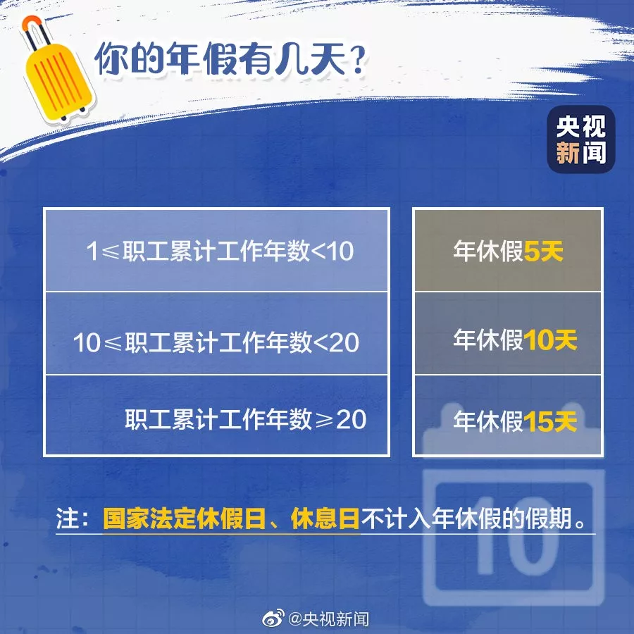 據(jù)《職工帶薪年休假條例》:職工累計(jì)工作時(shí)間已滿1年不滿10年,年休假5天;已滿10年不滿20年,年休假10天;已滿20年,年休假15天。