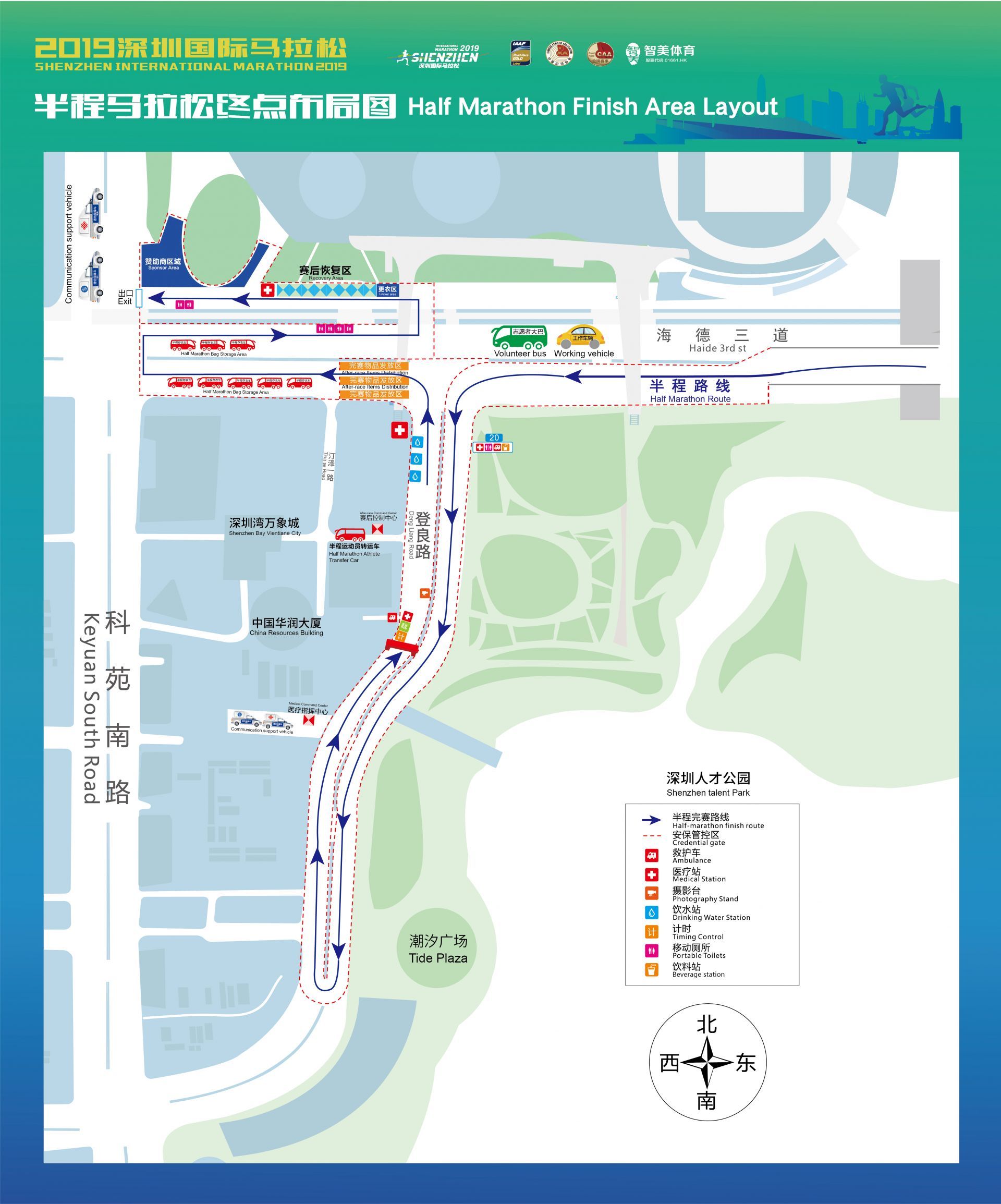 2.半程馬拉松路線為:深圳市民中心(起點(diǎn))→深南大道(北側(cè)西行)→沙河西路(西側(cè)南行)→ 望海路(婚慶公園折返)→沙河西路(東側(cè)北行)→海德三道(南側(cè)西行)→登良路北往南(折返)→登良路南往北路段(半程終點(diǎn))。