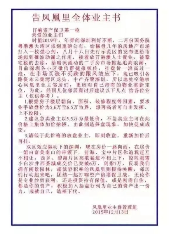 近日,福海街道中糧鳳凰里花苑小區(qū)個(gè)別業(yè)主發(fā)布集體漲價(jià)言論,涉嫌惡意炒作二手房?jī)r(jià),以下為網(wǎng)傳業(yè)主倡議書