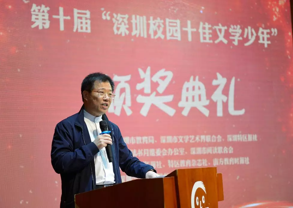 市教育局副局長王水發(fā)代表深圳市教育局向獲獎的同學表示熱烈祝賀。他說,為了培育社會核心價值、傳承民族文化基因、培養(yǎng)文化創(chuàng)意人才,深圳校園文學開辟了一條新的路徑,對深圳建設城市文明典范起到了奠基、培根和固本的重要作用。