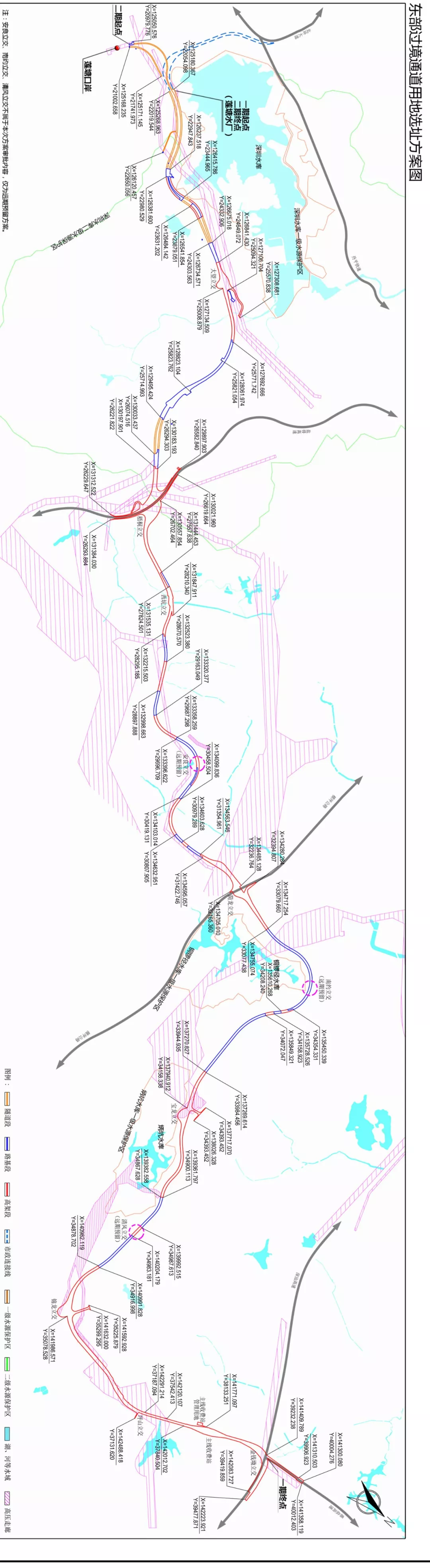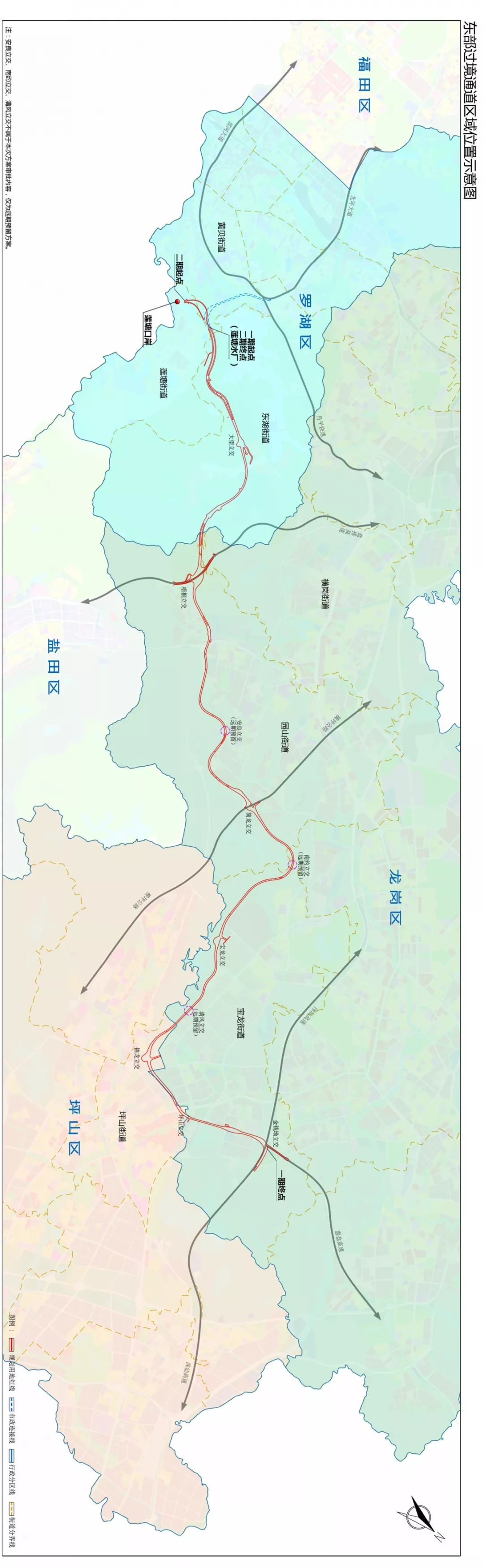 深圳市擬建設(shè)深圳市東部過(guò)境通道,途經(jīng)羅湖區(qū)蓮塘街道、黃貝街道和東湖街道,龍崗區(qū)橫崗街道、園山街道和寶龍街道,坪山區(qū)坪山街道,路線(xiàn)全長(zhǎng)約32.2公里。