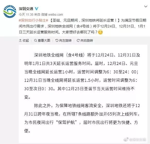 這里還要給大家插播一條交通消息。小編掐指一算,2019年馬上就要結(jié)束了,各位小伙伴是不是都開(kāi)始,為新年假期做準(zhǔn)備了呢?這么重要的出去浪的機(jī)會(huì),怎能為趕不上末班地鐵煩惱?不要緊,地鐵也延長(zhǎng)運(yùn)營(yíng)時(shí)間啦。