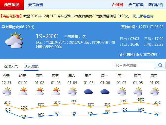 見圳客戶端·深圳新聞網(wǎng)2019年12月31日訊 即將到來的元旦小長假,12月31日至1月1日受冷空氣影響,陰天轉(zhuǎn)多云,沿海、高地和海區(qū)陣風6-7級,能見度轉(zhuǎn)好,氣溫下降3-4℃;元旦(1月1日)多云,可見陽光,早晨最低氣溫14℃左右,最高氣溫20℃;2日起冷空氣減弱,氣溫逐漸回升。