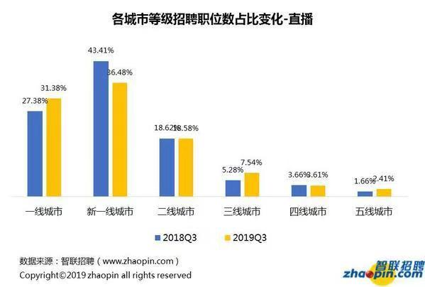 從趨勢上看,短視頻機(jī)構(gòu)隨著用戶的下沉也在下沉,而直播領(lǐng)域呈現(xiàn)進(jìn)一步向一線城市聚集的趨勢。2019年三季度,短視頻行業(yè)在一線城市的招聘需求占比較去年同期下降了7.21個(gè)百分點(diǎn),新一線、二線、三線等比例均有提高;直播行業(yè)在一線城市的招聘需求占比則是提高了4個(gè)百分點(diǎn)。(記者 莊瑞玉)