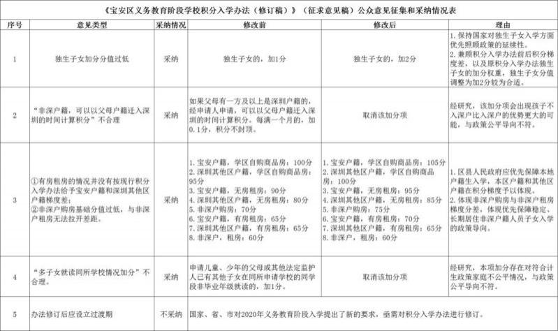 據(jù)了解,《寶安區(qū)義務(wù)教育階段學(xué)校積分入學(xué)辦法(修訂稿)》(征求意見稿)主要的修訂內(nèi)容是錄取方式和積分項(xiàng)目的變化和調(diào)整,在征求意見期間共收到市民朋友提出的意見892條。寶安區(qū)教育局將涉及面較廣、具有普遍性的意見進(jìn)行分類回復(fù)并予以公示,同時(shí)將經(jīng)論證修改后的修訂稿一并公示。市民如有新的建議可在1月9日前發(fā)郵件到 jcjyk@baoan.gov.cn進(jìn)行反饋。