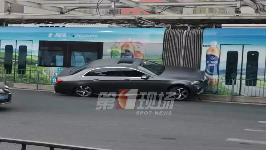 《第一現(xiàn)場》記者立即趕到事發(fā)地點(diǎn),看到有軌電車旁邊的2扇護(hù)欄被小車撞掉了,事發(fā)現(xiàn)場用警戒線圍著。監(jiān)控畫面顯示,今天下午16點(diǎn)48分,一輛黑色奔馳轎車在行駛過程中,突然騎上道路左邊的路沿石,撞倒了護(hù)欄之后,再撞到有軌電車。