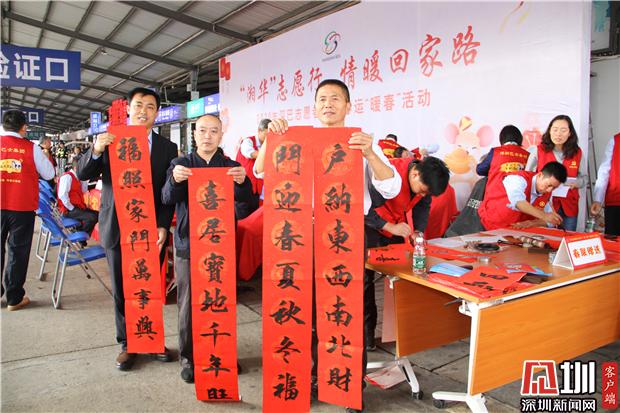深圳巴士集團(tuán)志愿者現(xiàn)場寫春聯(lián)贈給返鄉(xiāng)旅客。
