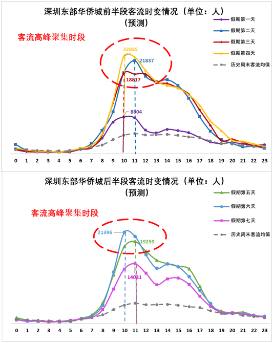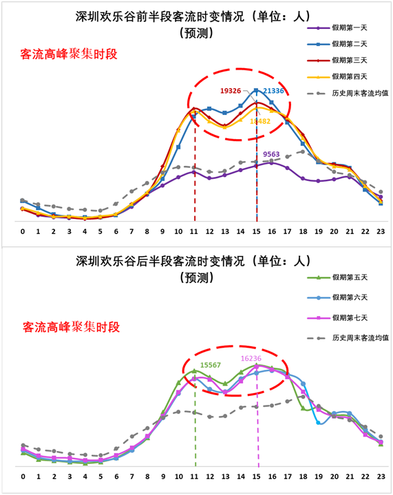 2、市內(nèi)熱門(mén)景區(qū)方面:預(yù)計(jì)1月25日至1月30日(正月初一至正月初六)深圳歡樂(lè)谷在11:00-12:00和15:00-16:00出現(xiàn)客流高峰、東部華僑城在10:00-11:00出現(xiàn)客流高峰;預(yù)計(jì)1月25日至1月27日(正月初一至正月初三),歡樂(lè)海岸在15:00前后出現(xiàn)客流高峰。