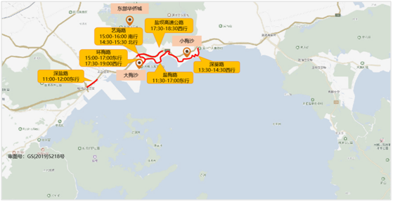 預(yù)計(jì)東部華僑城-大小梅沙片區(qū)春節(jié)假期周邊主要擁堵路段有深鹽路(11:00-12:00東行)、環(huán)梅路(15:00-17:00東行、17:30-19:00西行)、藝海路(15:00-16:00南行、14:30-15:30北行)、鹽壩高速公路(17:30-18:30西行)、鹽梅路(11:30-17:00東行)、深葵路(13:30-14:30西行)。具體分布如下:
