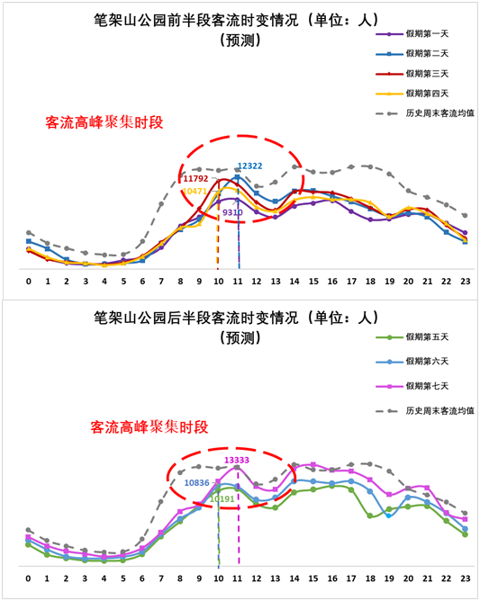 今年春節(jié)假期,預(yù)計(jì)筆架山公園客流量整體小于歷史周末客流量,客流高峰將出現(xiàn)在10:00-11:00。每日小時(shí)客流量分布如下: