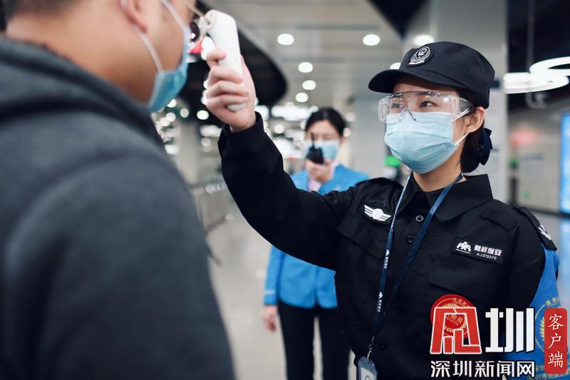 在深圳機(jī)場(chǎng),工作人員對(duì)往來乘客進(jìn)行體溫檢測(cè)。