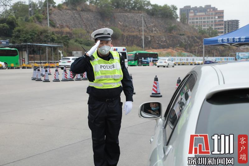 深圳交警民警向往來車輛司機敬禮致意。