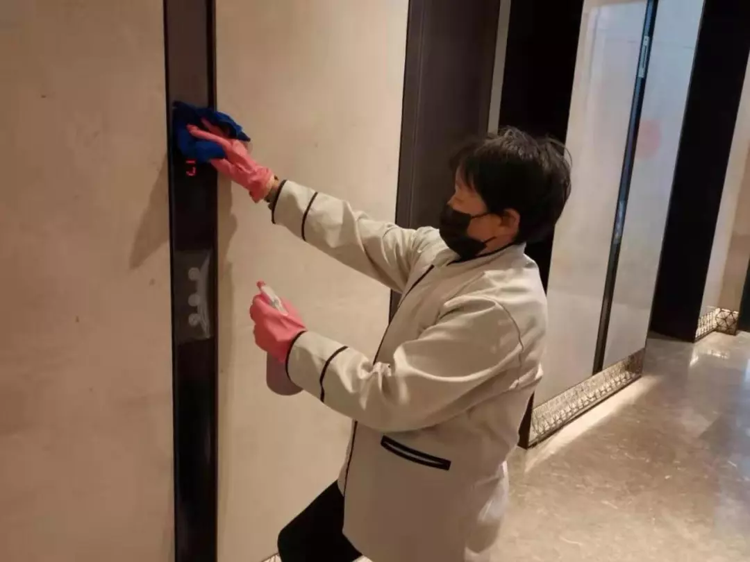 每天對小區(qū)公共區(qū)域大堂門把手、門禁對講機(jī)、電梯按鍵、大堂茶幾沙發(fā)等高頻接觸區(qū)進(jìn)行消毒及對轎廂按鈕定時更換保鮮貼膜。