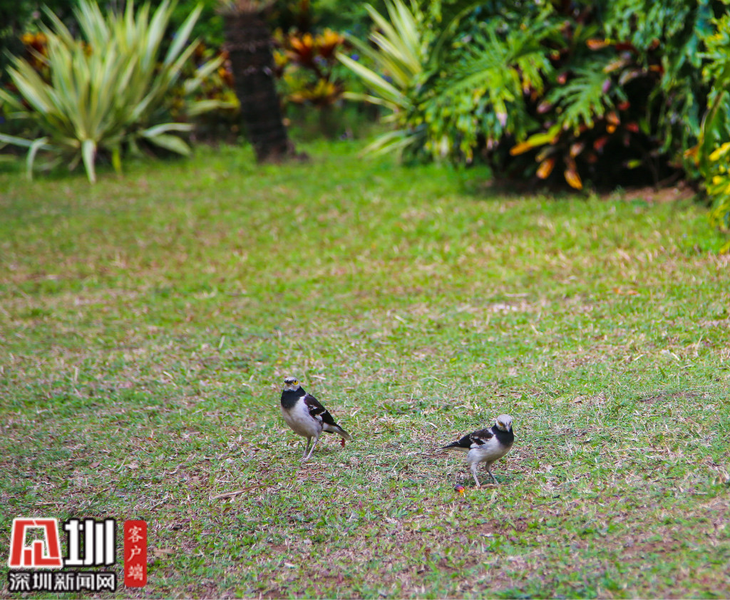 公園內(nèi)閑庭踱步的兩只麻雀。