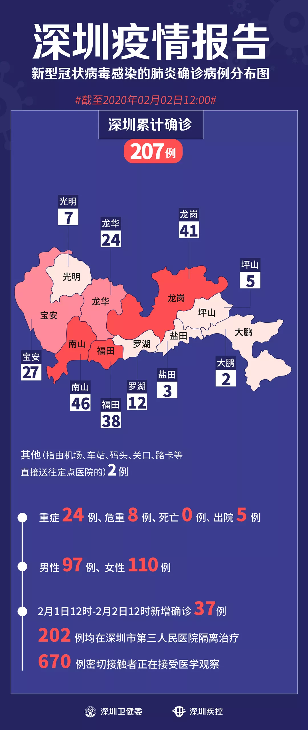 2月1日12時-2月2日12時,深圳新增新型冠狀病毒感染的肺炎確診病例37例。