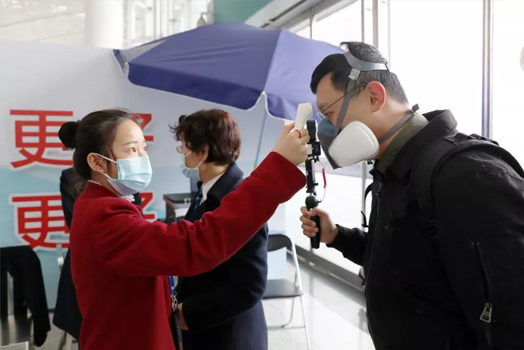 深圳北站工作人員對旅客進行體溫檢查。