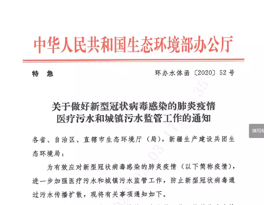 而在2月1號(hào)深夜,生態(tài)環(huán)境部印發(fā)通知,部署醫(yī)療污水和城鎮(zhèn)污水監(jiān)管工作,規(guī)范醫(yī)療污水應(yīng)急處理、殺菌消毒要求,防止新型冠狀病毒通過(guò)糞便和污水?dāng)U散傳播。