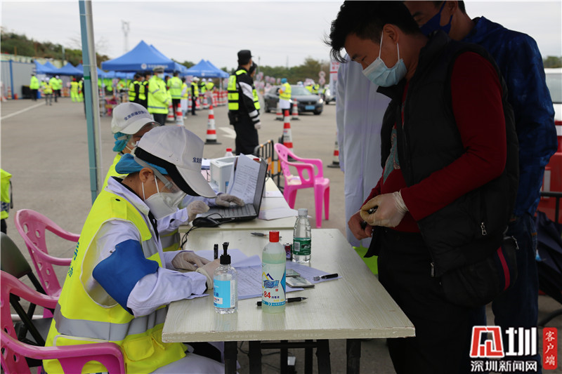 龍崗區(qū)文化館工作人員楊麗(右)負責(zé)檢查卡點復(fù)檢區(qū)資料錄入工作。