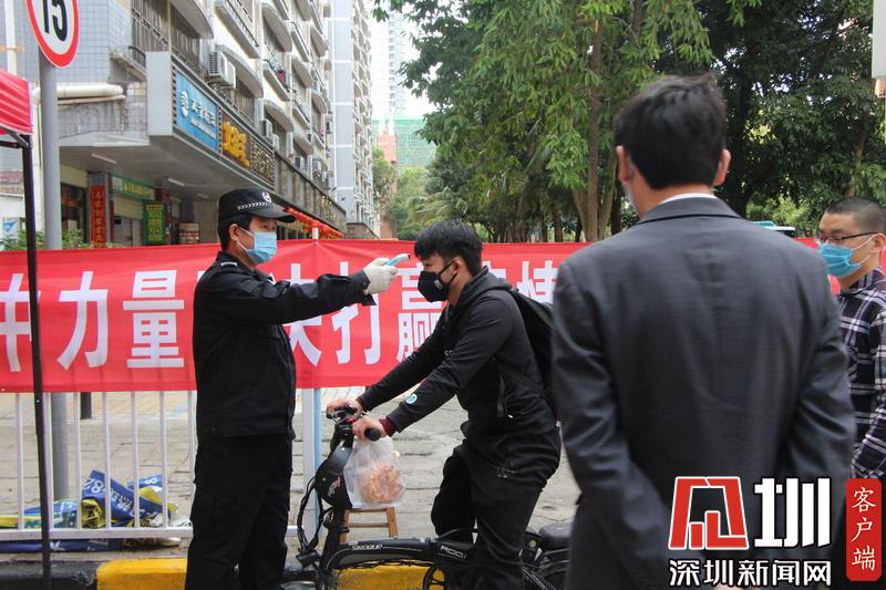 福田梅山苑保安正為一名進(jìn)入小區(qū)的住戶測(cè)量體溫。