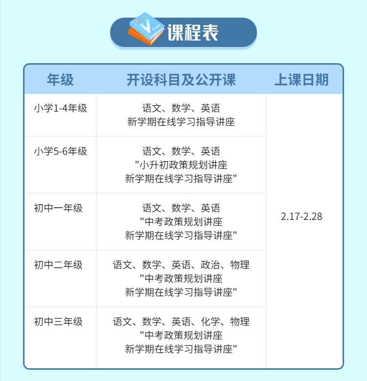 據(jù)悉,本次公益校內(nèi)同步直播課程涵蓋各年級(1-9年級),各學(xué)科(語文、數(shù)學(xué)、英語、政治、物理、化學(xué)等)。“覆蓋廣、課程精、師資強(qiáng)、服務(wù)優(yōu)、全免費”是本次直播課程的特色亮點。