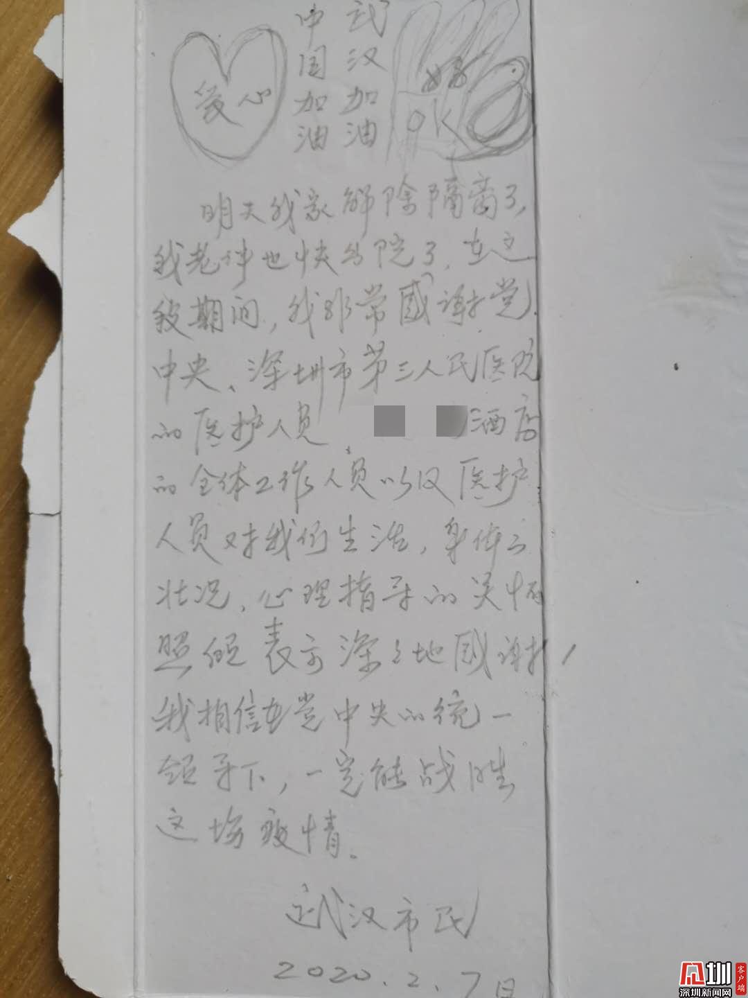 2月7日,一位來(lái)深的武漢市民在離開桃源定點(diǎn)隔離酒店前,匆忙中不忘撕下一片紙巾盒,用酒店的鉛筆留下一張暖心紙條,對(duì)陪他度過(guò)14天隔離期的工作人員表達(dá)由衷的感激,對(duì)全民抗“疫”的前景表示必勝的信心。