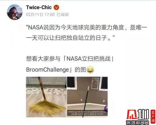 見(jiàn)圳客戶(hù)端·深圳新聞網(wǎng)2020年2月11日訊 (見(jiàn)圳客戶(hù)端、深圳新聞網(wǎng)記者 吳英敏)2月11日,有網(wǎng)友在微博曬出兩張掃把直立的照片:“宅在家里試了一下NASA立掃把挑戰(zhàn),據(jù)說(shuō)一年中只有今天可以立起來(lái),親測(cè)有效!”記者也在朋友圈發(fā)現(xiàn)許多朋友紛紛曬出掃把直立成功的圖片,有網(wǎng)友稱(chēng),“宅家立掃把”將全國(guó)人民心相連了!隨后,人民日?qǐng)?bào)微博辟謠稱(chēng),真相是,掃帚能立起來(lái)與今天的引力無(wú)關(guān),每天都可以立,只要你能找到平衡!