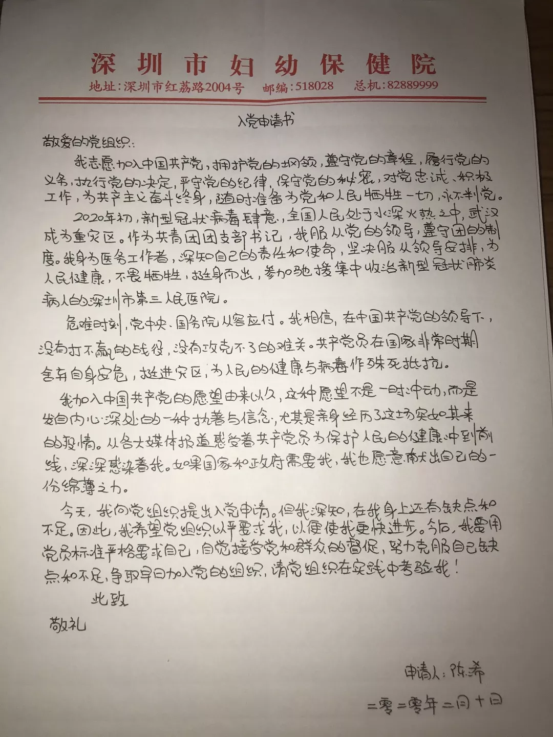2月10日,陳浠在戰(zhàn)“疫”一線向組織提交了入黨申請書,她表示要以實際行動向身邊的共產(chǎn)黨員學習,希望早日加入黨組織,在抗擊疫情的一線,在今后的每一天,充分發(fā)揮黨員的先鋒模范作用。