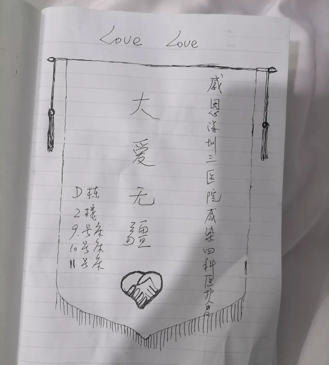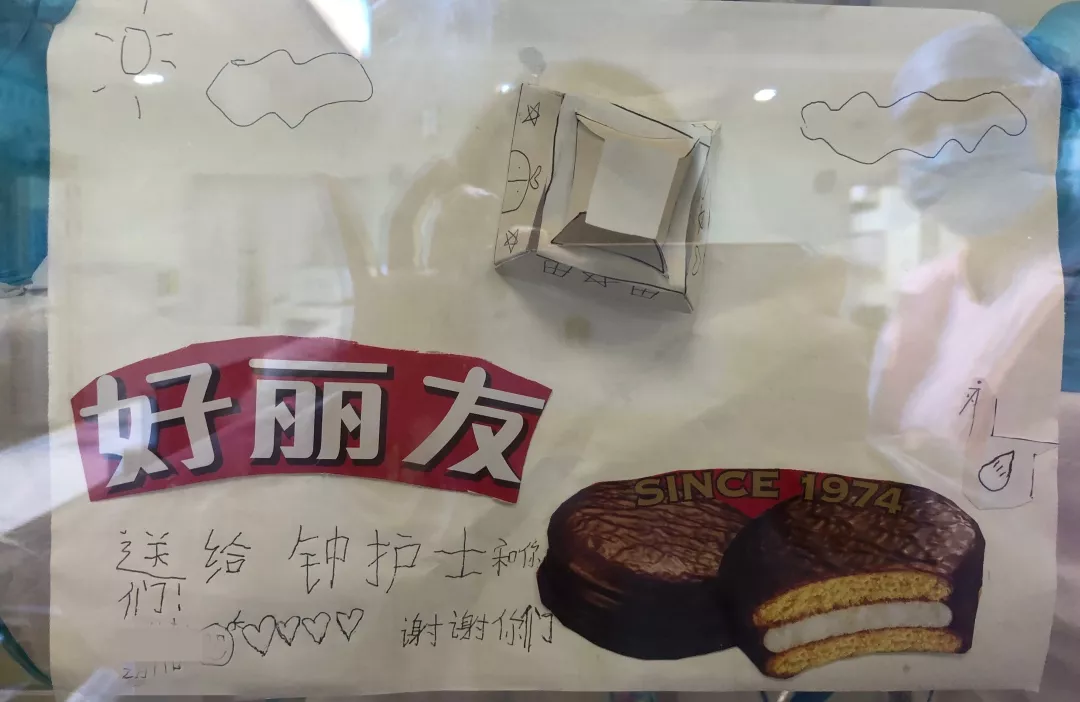 2月11日,深圳市三醫(yī)院兒科護(hù)士們收到了一個(gè)用好麗友餅干盒制作的手工賀卡,上面寫著“送給鐘護(hù)士和你們!謝謝你們”,賀卡上還畫了一張笑臉和四個(gè)心形。
