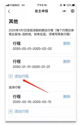 答:屬于返深人員,需要自主申報。返深人員必須填報2020年1月1日后離深的既往全部行程。如有多段行程,請在填報了第一條行程后,點擊“添加行程”或“添加下一條”按鈕,保存當(dāng)前行程并繼續(xù)添加下一條行程。您這種情況需填報3條行程記錄,分別是:深圳-黃山、黃山-東莞、東莞-深圳。
