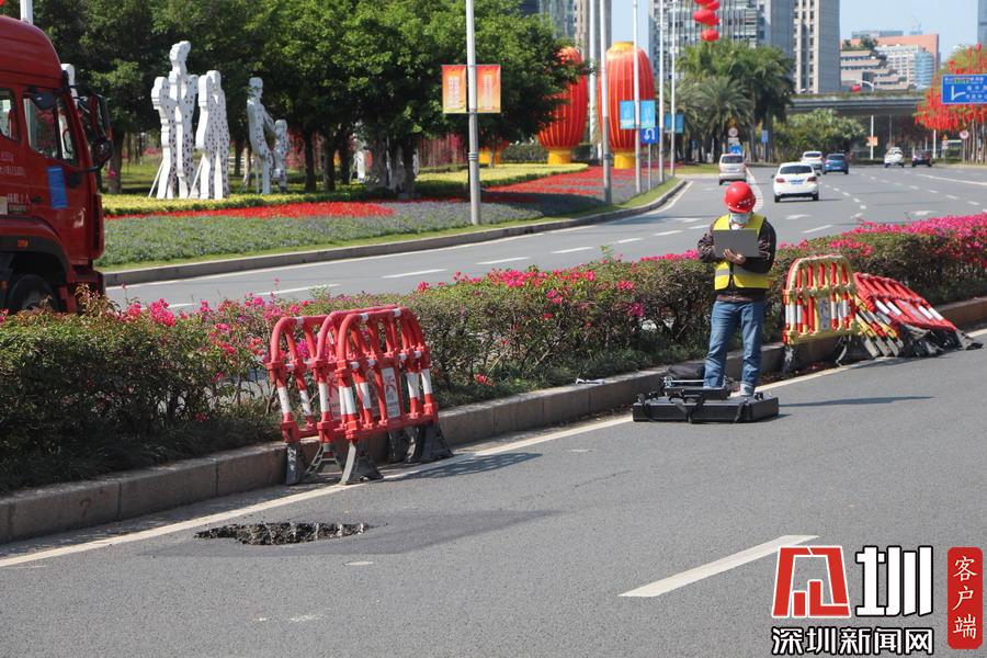 深圳市民廣場前一輔路驚現(xiàn)直徑一米坑 有關部門:正加緊修復