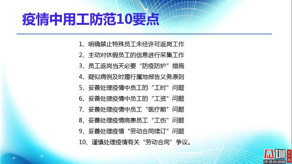見(jiàn)圳客戶端?深圳新聞網(wǎng)2020年2月18日訊見(jiàn)圳客戶端、深圳新聞網(wǎng)記者 焦慧茹)疫情影響了社會(huì)的方方面面,給企業(yè)和職工帶來(lái)了新的問(wèn)題。對(duì)于廣大職工而言,擔(dān)心的是疫情期間工資發(fā)放、復(fù)工安排等。對(duì)于企業(yè)而言,擔(dān)心的是如何順利復(fù)工復(fù)產(chǎn)。為此,深圳市總工會(huì)聯(lián)合深圳新聞網(wǎng)推出“復(fù)工防疫微課堂”第六期,邀請(qǐng)講師楊文浩,分析、整理了疫情之下企業(yè)復(fù)工用工防范要點(diǎn),幫助大家解決困惑。