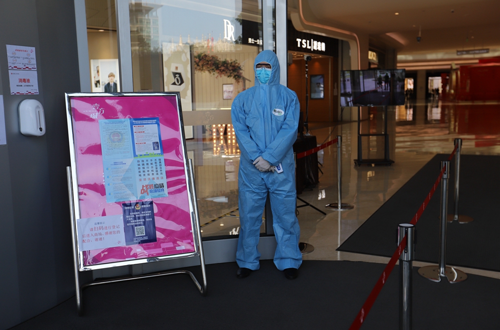 當(dāng)天上午11時(shí),記者來(lái)到壹方城,過去熱鬧的正門廣場(chǎng)上如今僅有寥寥幾個(gè)行人。往大門走去,記者看到兩側(cè)的門已經(jīng)關(guān)閉,只留下中間的通道給市民進(jìn)出,進(jìn)口和出口分開,市民進(jìn)入商場(chǎng)時(shí)必須掃碼實(shí)名登記,身著防護(hù)服的工作人員在入口處引導(dǎo)市民登記和測(cè)溫。